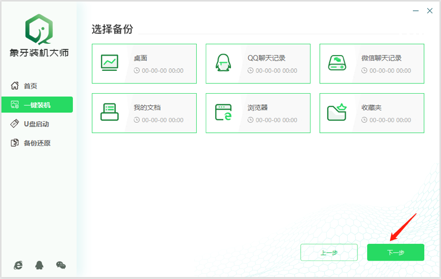 勾选需要备份的数据,其中浏览器项只备份浏览器的收藏夹网址(如果您还有其他重要数据在C盘,需要您自己手动备份).然后点击下一步